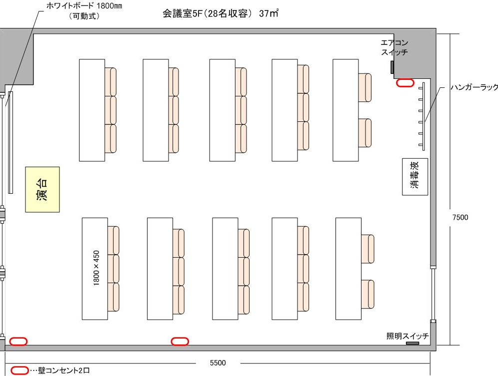 会議室5F(28名収容) 会議室詳細 広さ 37㎡ 付帯備品(無料) ホワイトボード / 演台 / テーブル(1800mm3人掛け)4台 / テーブル(1200mm2人掛け)8台 / 椅子28脚 収容人数 【基本】スクール シアター ロの字 コの字 島 型 28名 38名 20名 17名 20名 ※基本レイアウトは、スクール形式となります。レイアウト変更を行った場合は、原状回復をお願い致します。 有料にて、「レイアウト変更」・「原状回復」承っております(各1,600円) 会議室写真・図面 ※クリックすると画像が大きく表示されます 会議室価格 ※下記「会議室価格」ボタンをクリックにてください 貸会議室TOP お申込み・空室状況 会議室6A(15名収容) 会議室6B(8名収容) 会議室6C(24名収容) 会議室6D(6名収容) 会議室5A(10名収容) 会議室5B(4名収容) 会議室5C(2名収容) 会議室5D(18名収容) 会議室5E(58名収容) 会議室5F(28名収容) 会議室5G(64名収容) 会議室5H(36名収容) 会議室5I(33名収容) ご利用までの流れ お支払いについて キャンセルについて 荷物サービスについて 利用規約