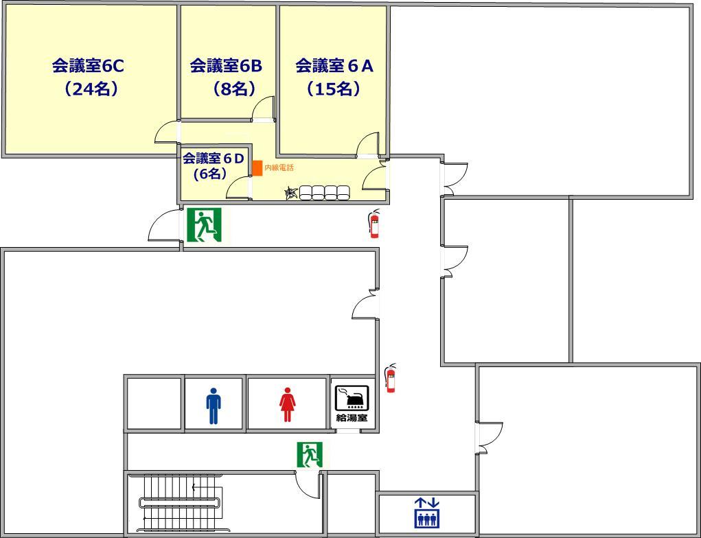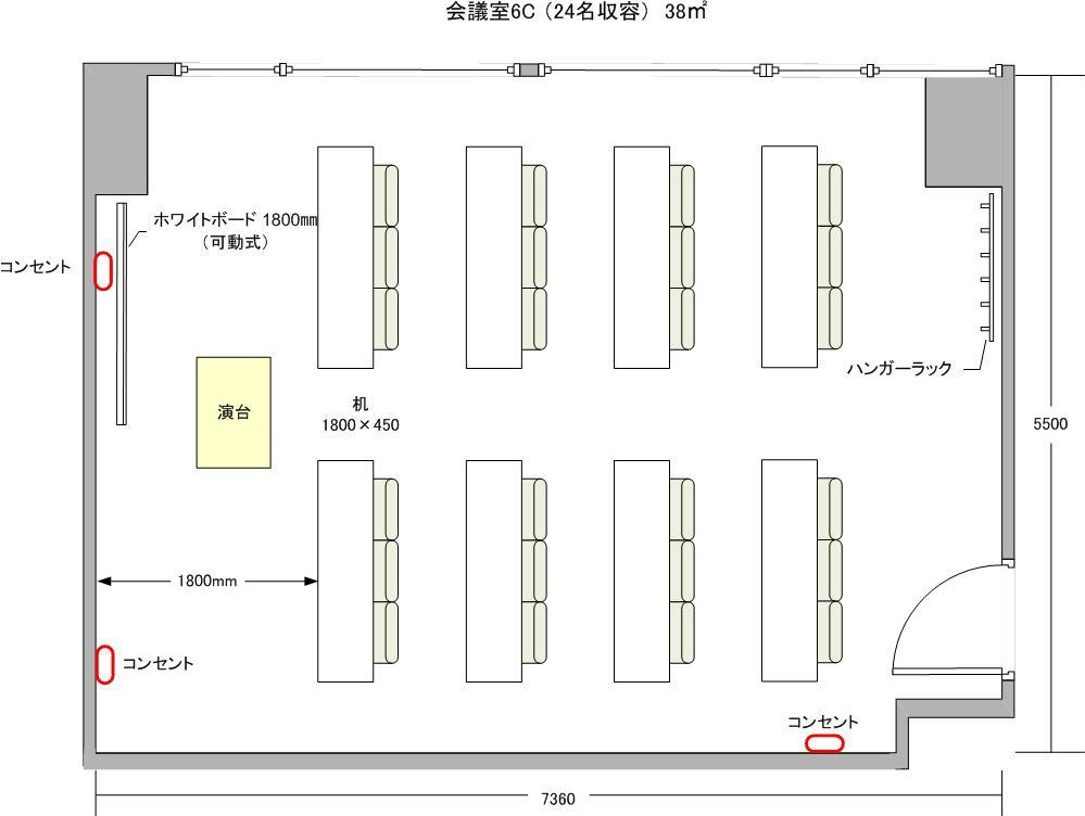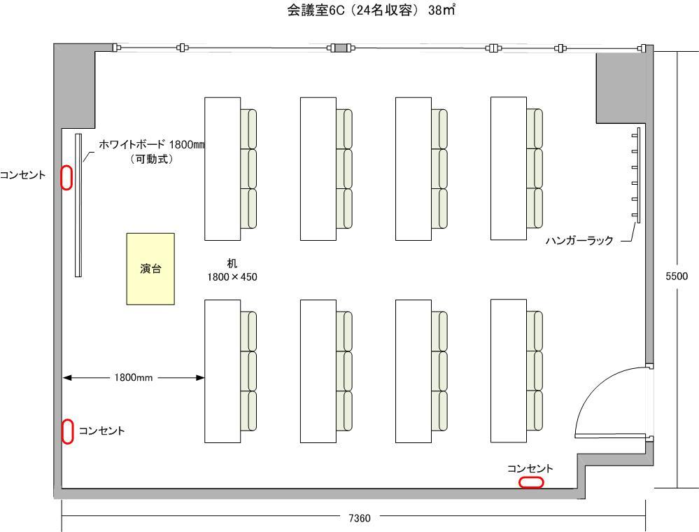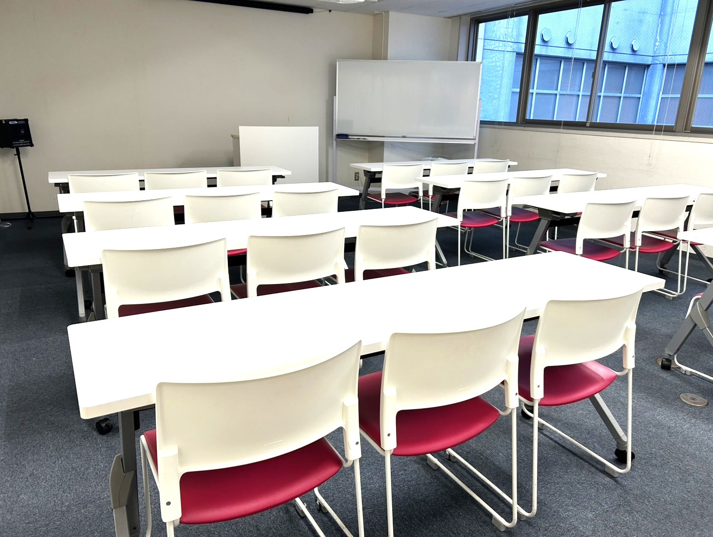 | 付帯備品(無料) | ホワイトボード / 演台 / テーブル(1800mm3人掛け) 8台 / 椅子 24脚 |